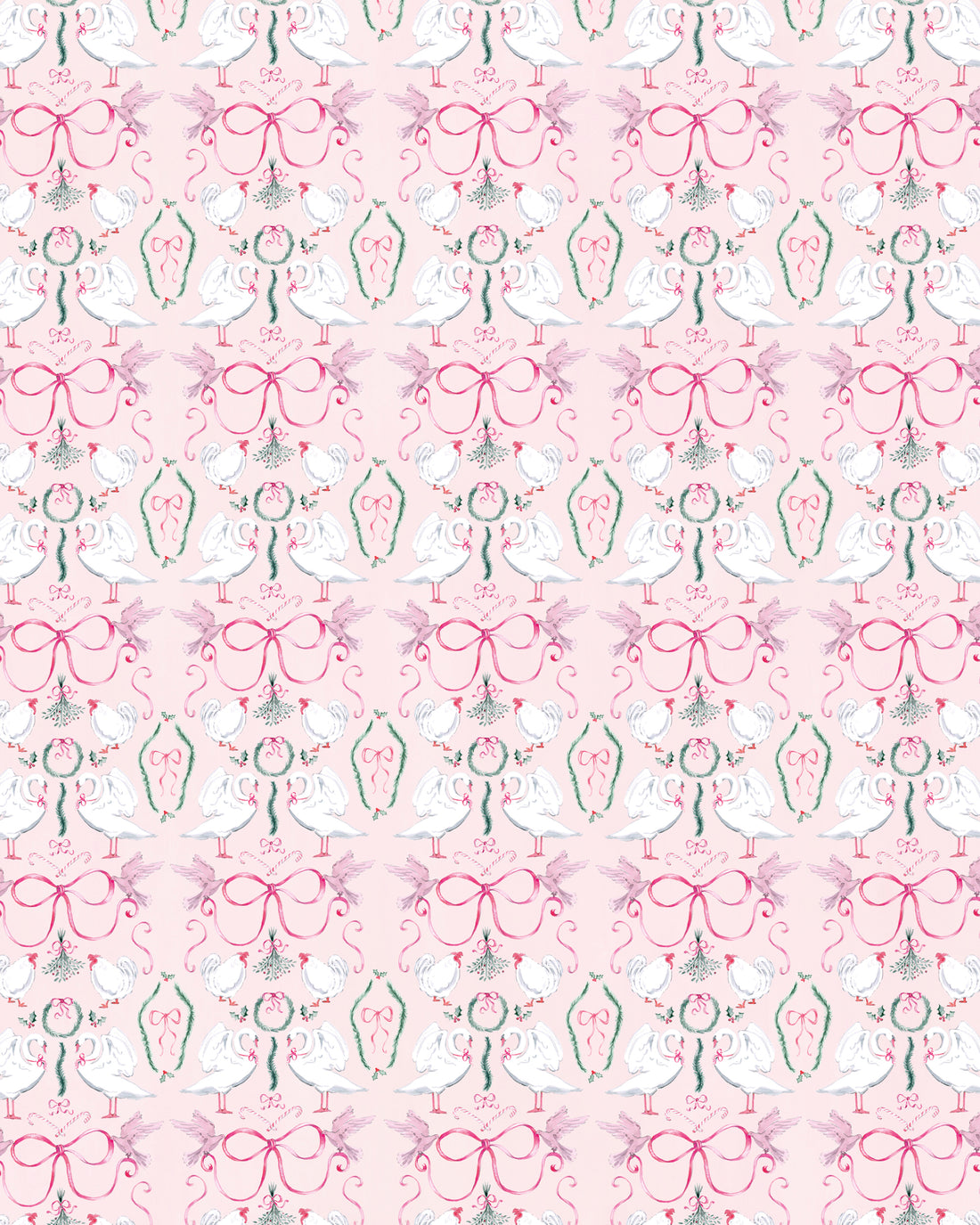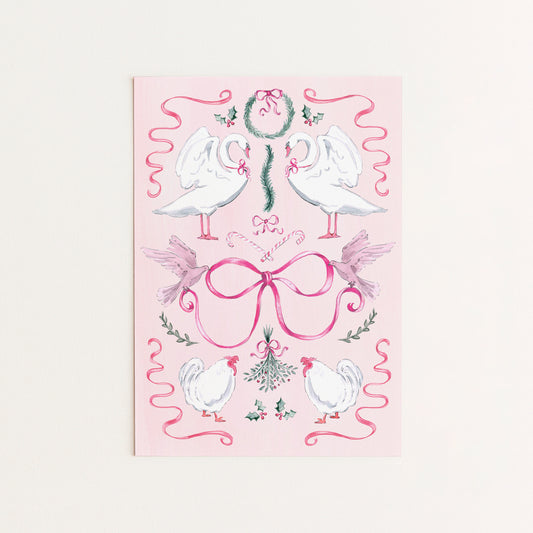 Description: Elegant pink single Christmas card with illustrations from the 12 Days of Christmas song....