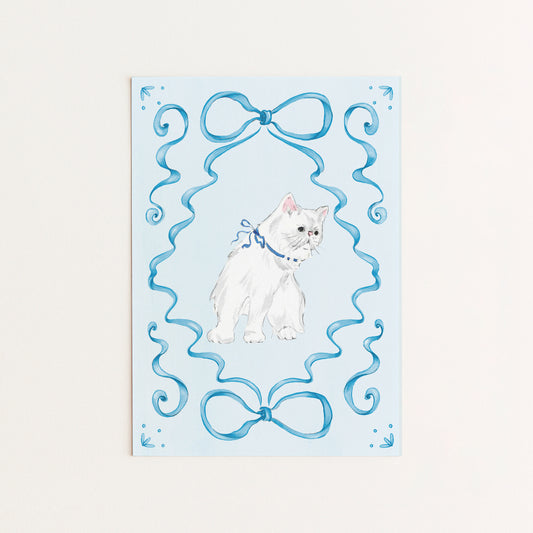 Description: Blue small card with an adorable, vintage-style kitten illustration and a delicate, festive, and...