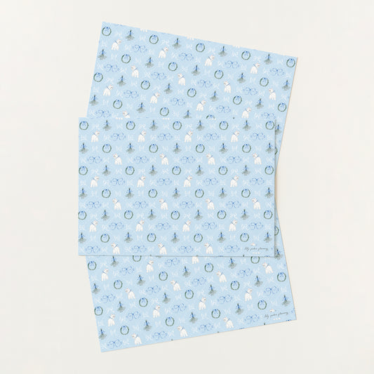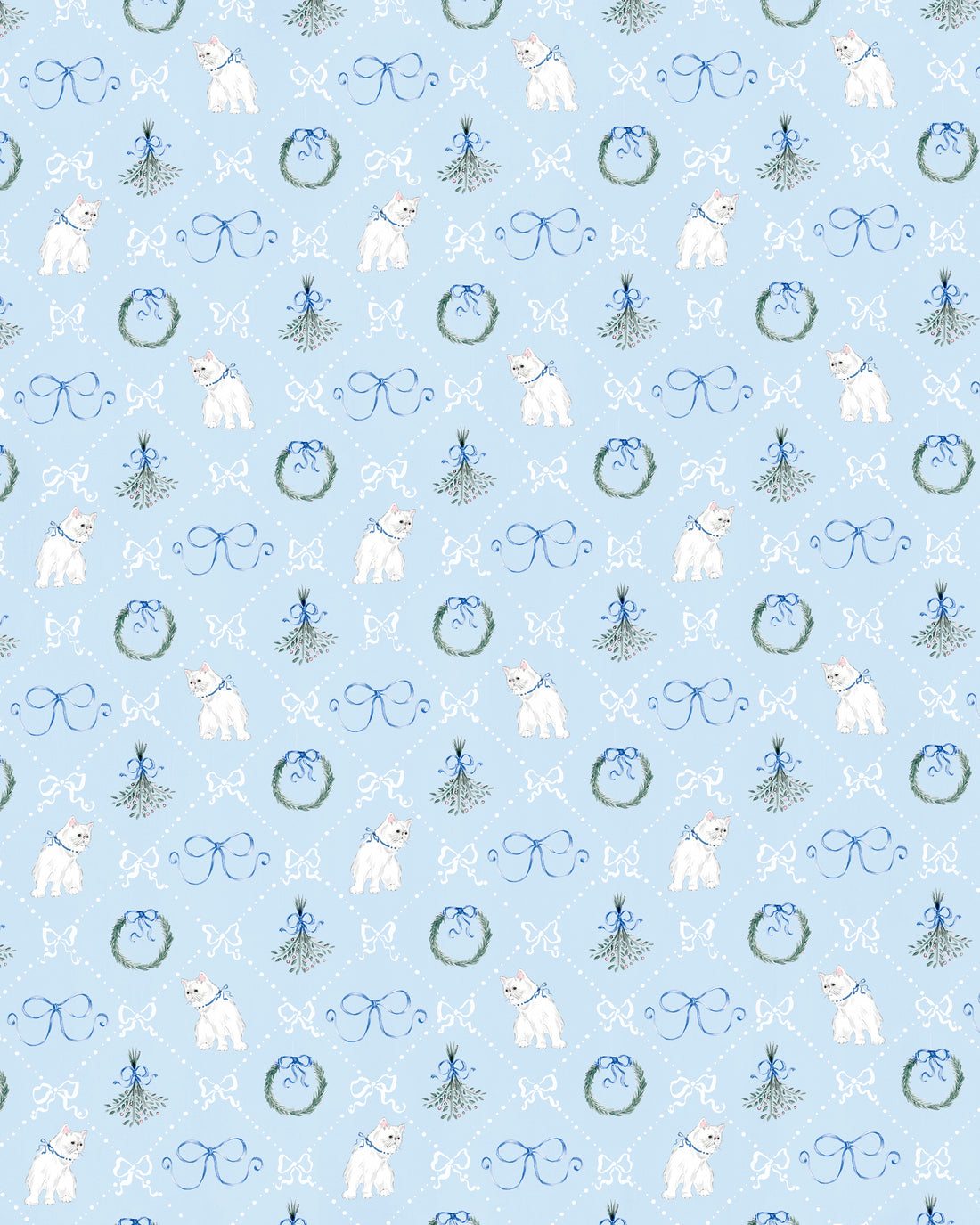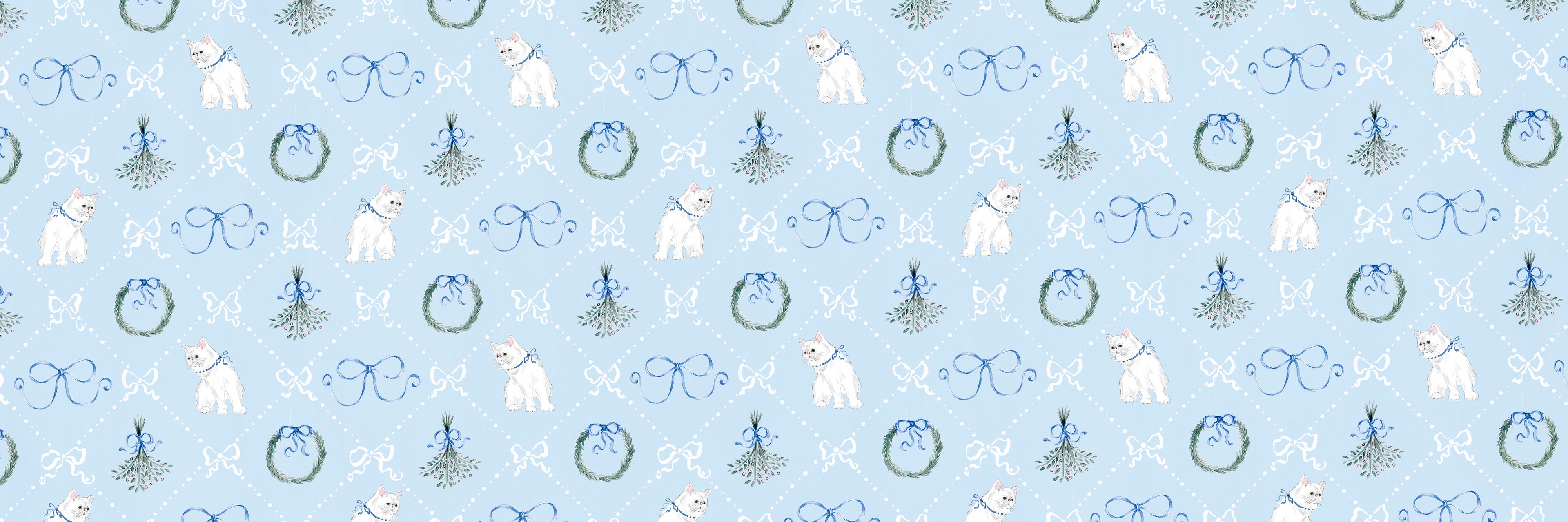 Description: Kitsch, coquette, vintage-inspired, adorable, blue Christmas wrapping paper sheet with illustrations of a kitten,...