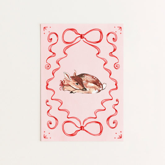 Description: Pink and red small card with an adorable, cute, vintage-style baby deer illustration and...