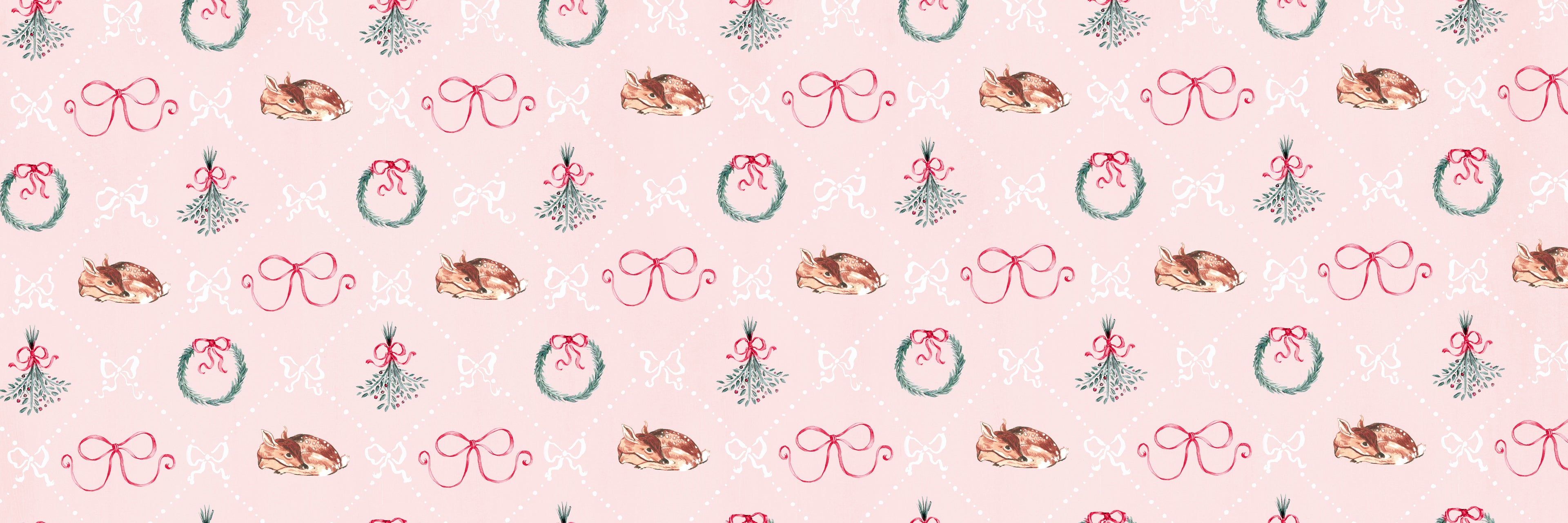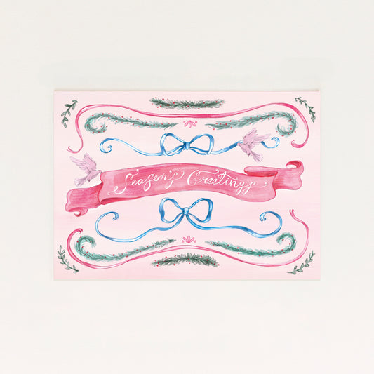 Description: Horizontal, typographical single pink Christmas card with “Season’s Greetings” calligraphy alongside delicate coquette ribbons,...