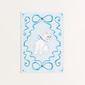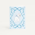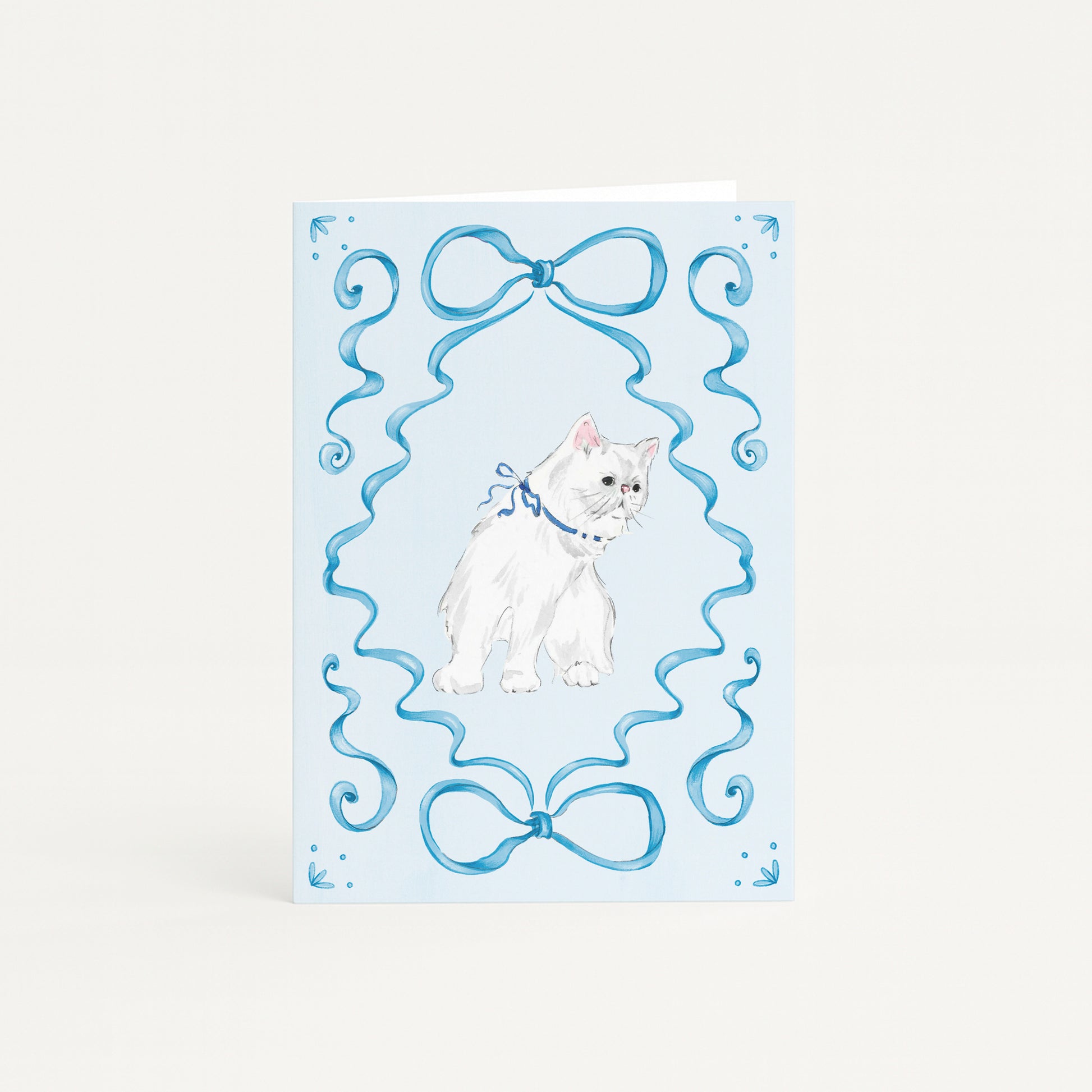 Blue small card with an adorable, vintage-style kitten illustration and a delicate, festive, and coquettish ribbon bow border.