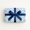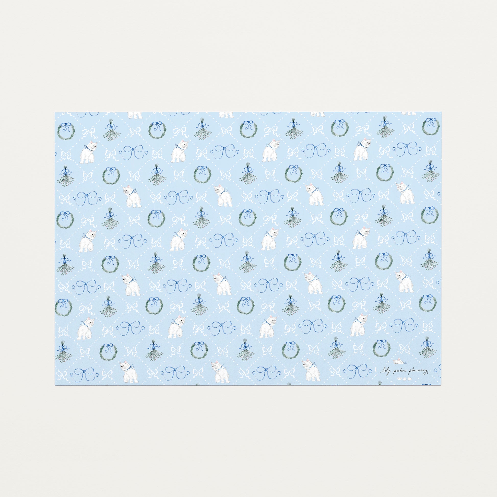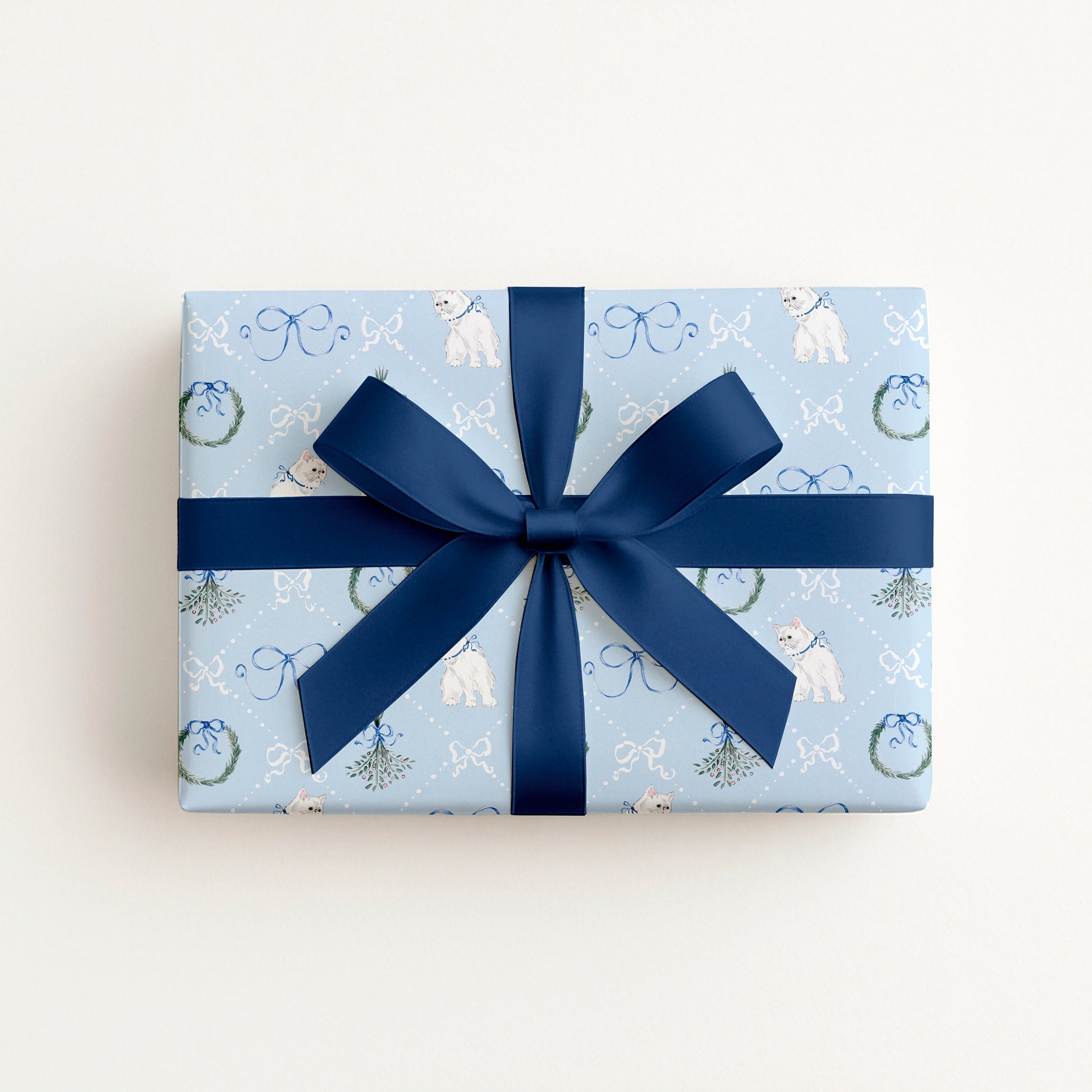 Kitsch, coquette, vintage-inspired, adorable, blue Christmas wrapping paper sheet with illustrations of a kitten, mistletoe, wreaths, and delicate ribbons and bows forming a diamond pattern. Printed at a high quality on luxurious, eco-friendly matte paper that’s easy to fold and perfect for wrapping.