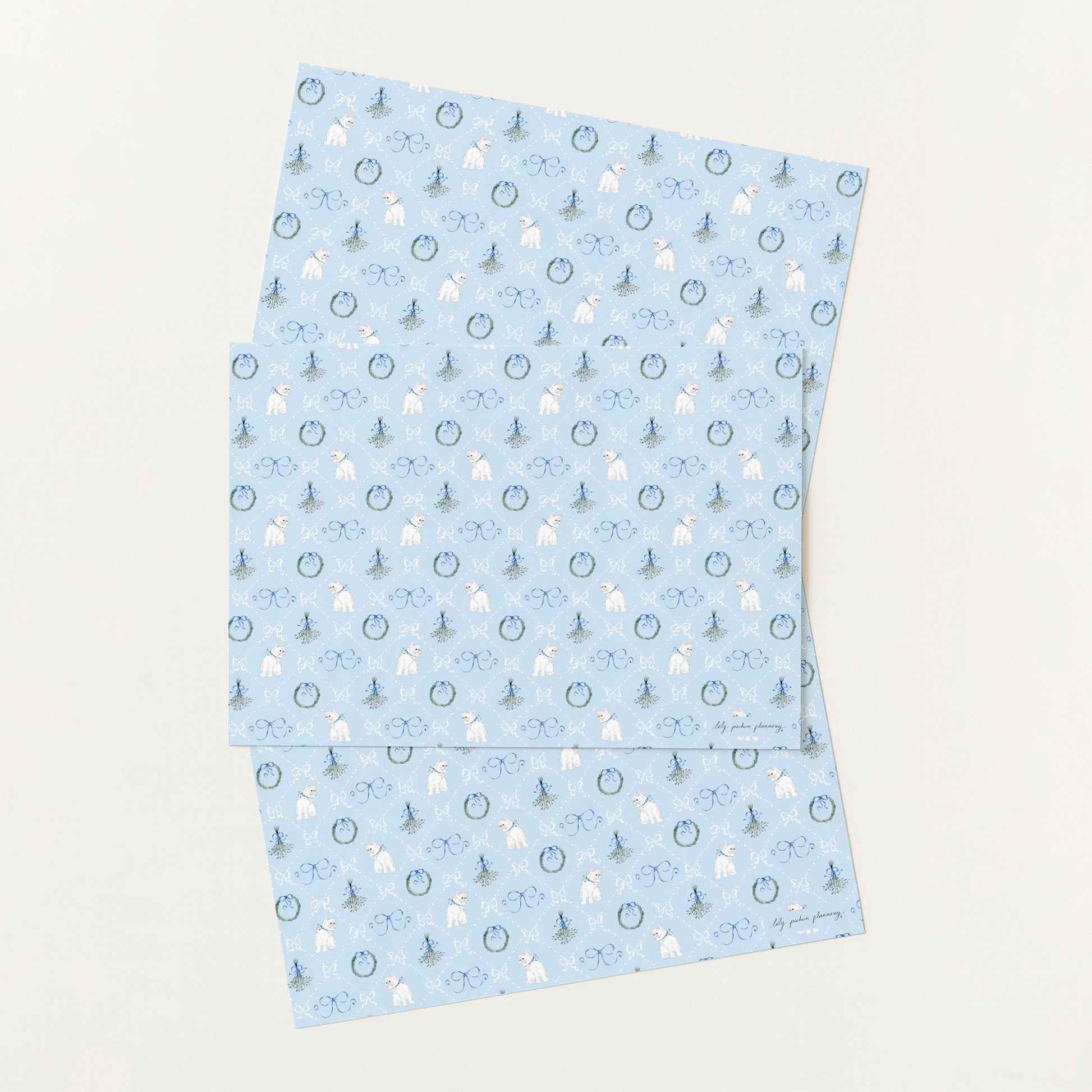 Kitsch, coquette, vintage-inspired, adorable, blue Christmas wrapping paper sheet with illustrations of a kitten, mistletoe, wreaths, and delicate ribbons and bows forming a diamond pattern. Printed at a high quality on luxurious, eco-friendly matte paper that’s easy to fold and perfect for wrapping.
